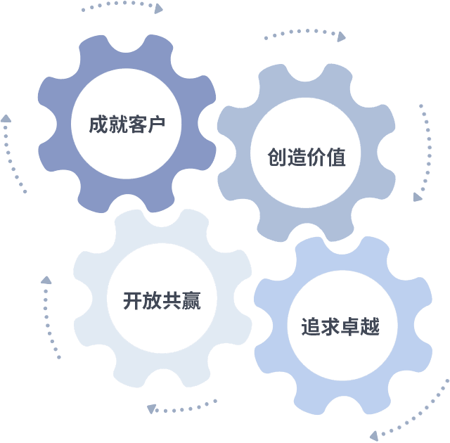 成就客户是一切决策的出发点,,,,创造价值是衡量所有工作的标准,,,追求卓越是我们做事做人的态度,,,,开放共赢是我们的格局也是最终的结果。。。。价值观的齿轮环环相扣,,,,推动着组织里的每个人不断向前。。。。